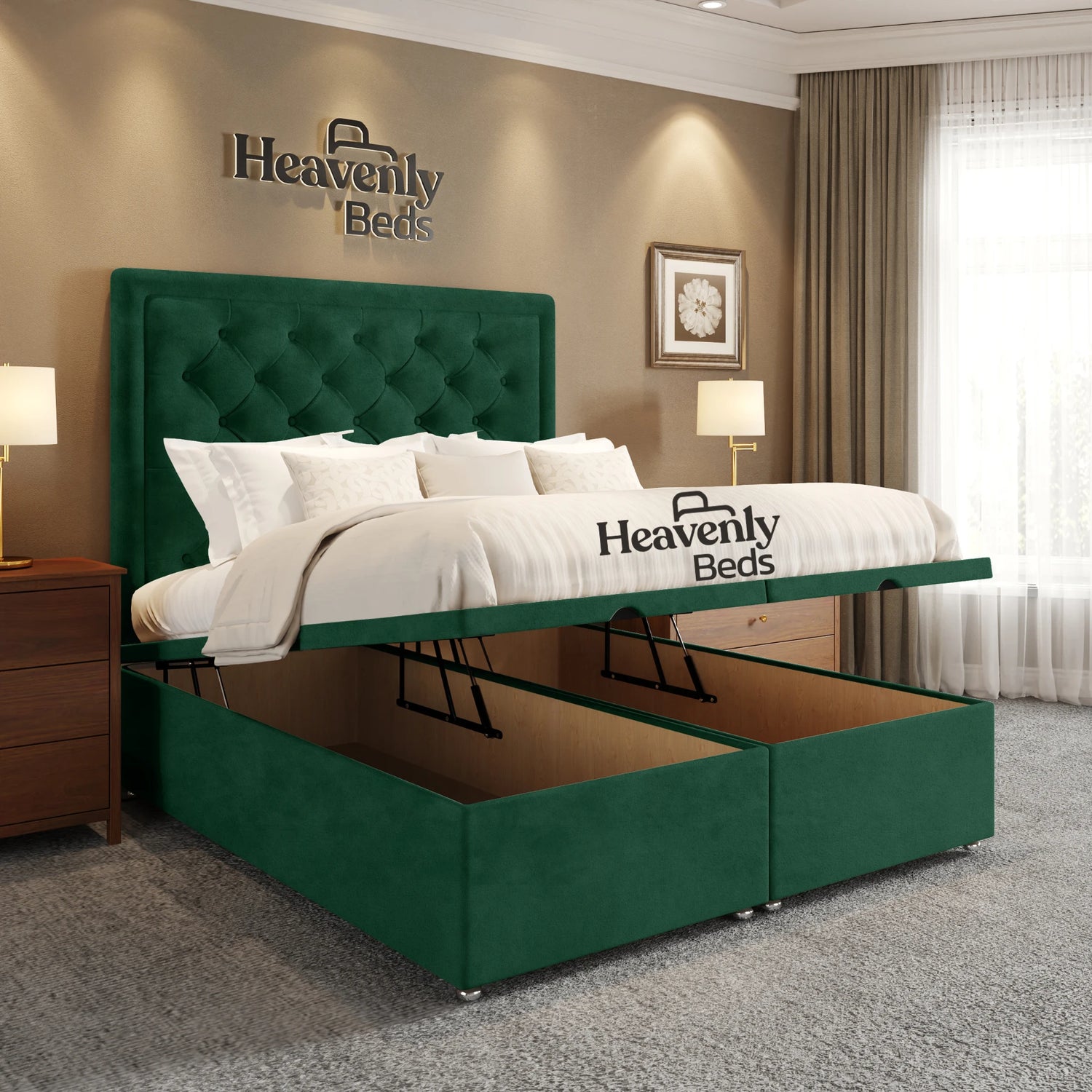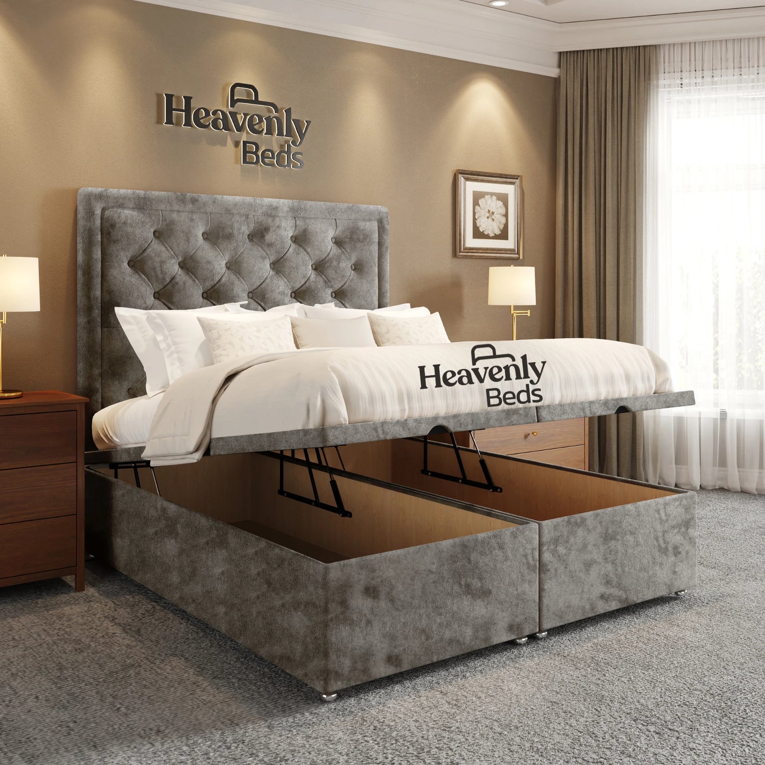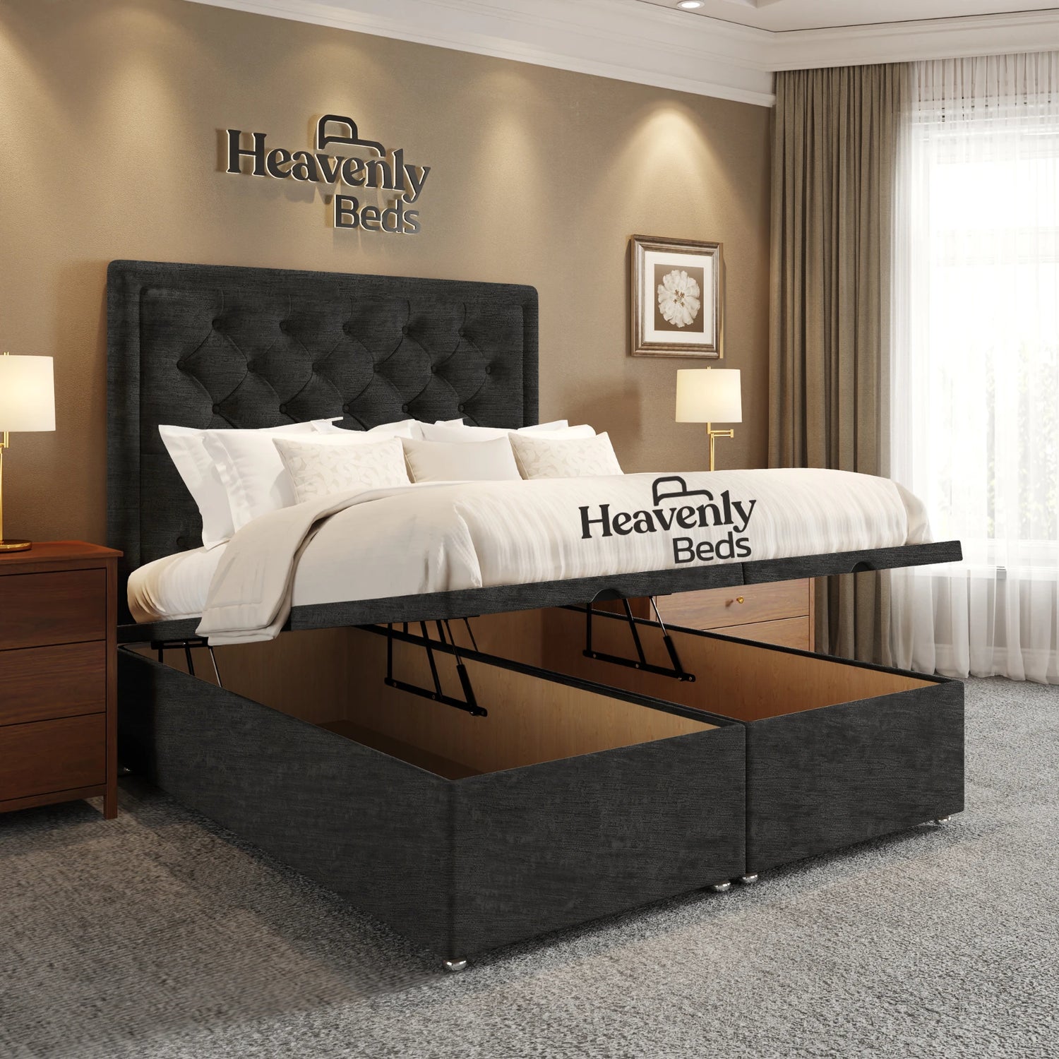 king size and super king size options that offer nothing but luxury and comfort. Besides serving as a beautiful piece of furniture in your bedroom this stylish upholstered bed frame serves as a storage bed that helps keep your space neat.