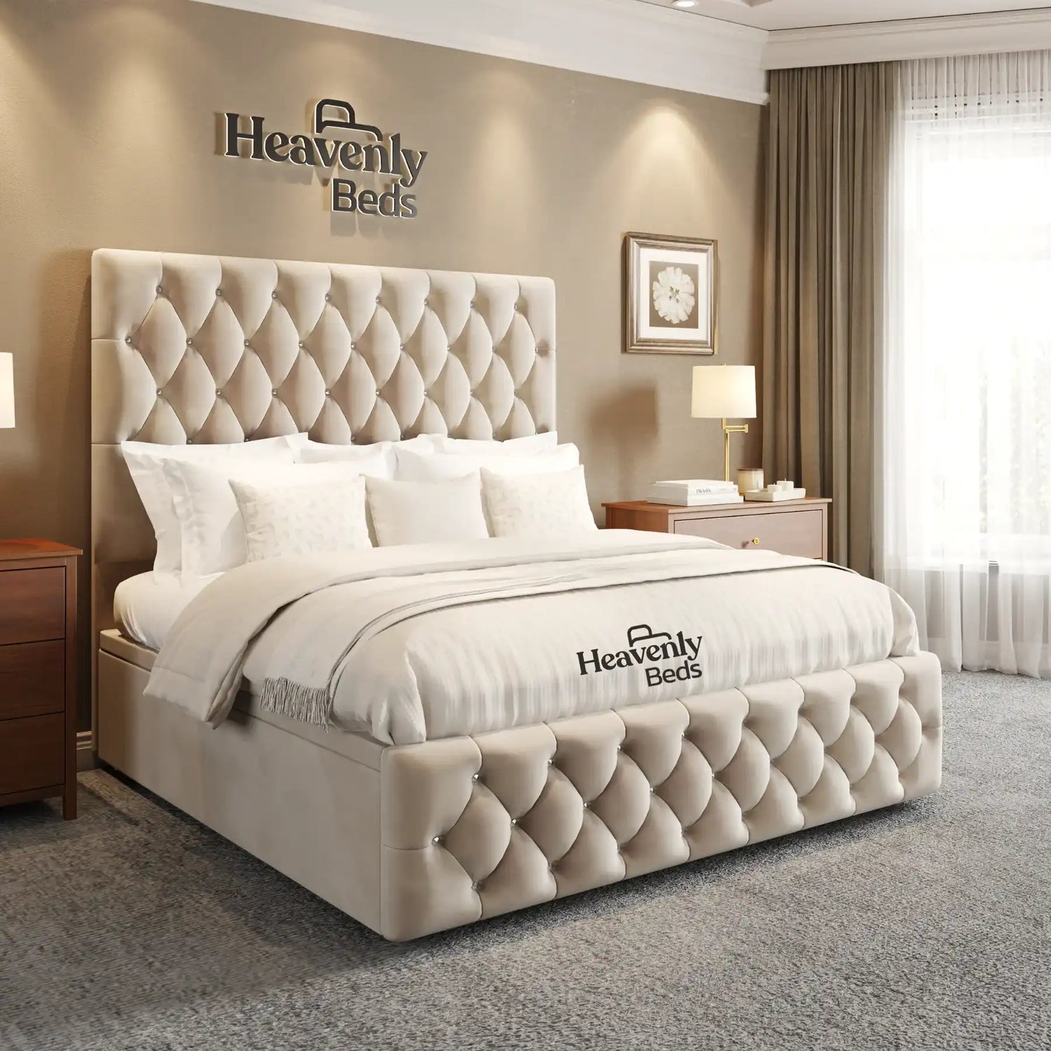 king size and super king size options that offer nothing but luxury and comfort. Besides serving as a beautiful piece of furniture in your bedroom this stylish upholstered bed frame serves as a storage bed that helps keep your space neat.