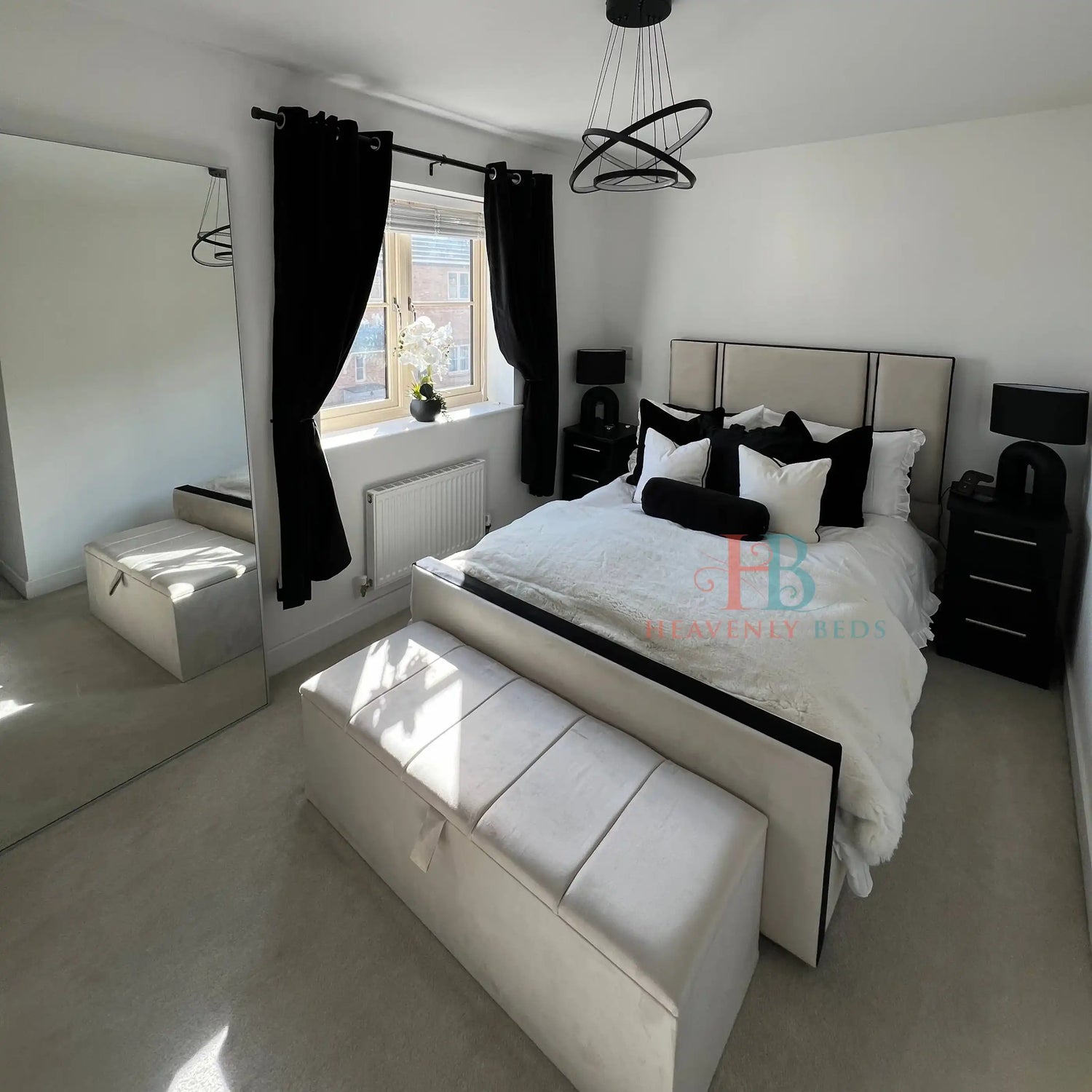 • Tall panelled headboard with sleek black piping detail